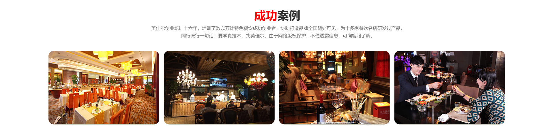 | 职业培训 | 《英佳尔店面运营指导》、《餐饮店选址方法和技巧》、《资源整合》、《利益共同体》、《餐饮品牌定位》、《英佳尔开店服务》、《市场调查方法》、《开店策划书》、《餐饮创新》、《开业活动策划》、《O2O网络营销》 |